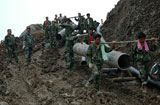 堰塞湖抢险人员正在搬运排水管(6月16日摄)。