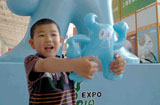 6月16日,一位哈尔滨小朋友与"海宝"合影。